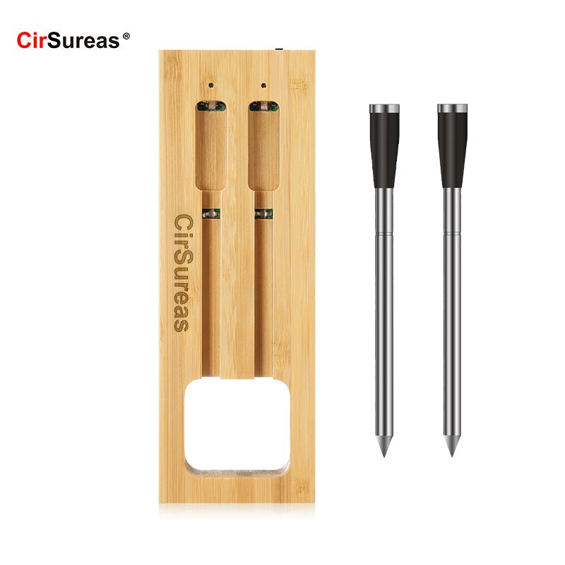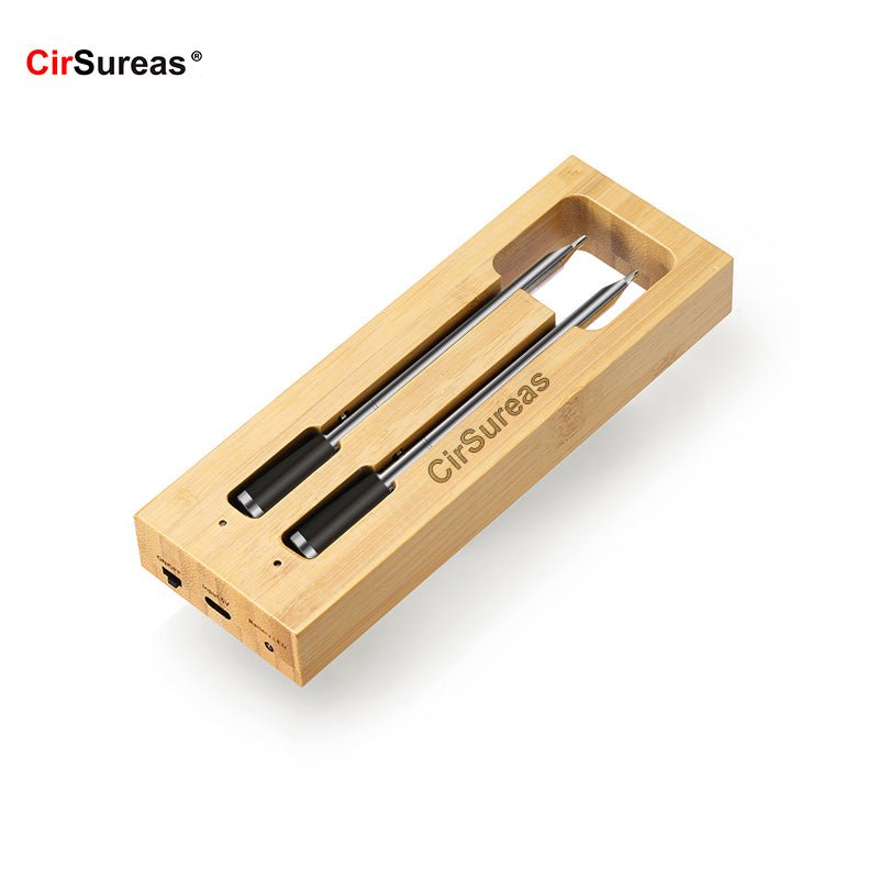 Survives rain, grease splashes, and sink washes. Probes feature heat-resistant Peek coating and LFGB-certified materials. Bamboo charging dock adds rustic durability.